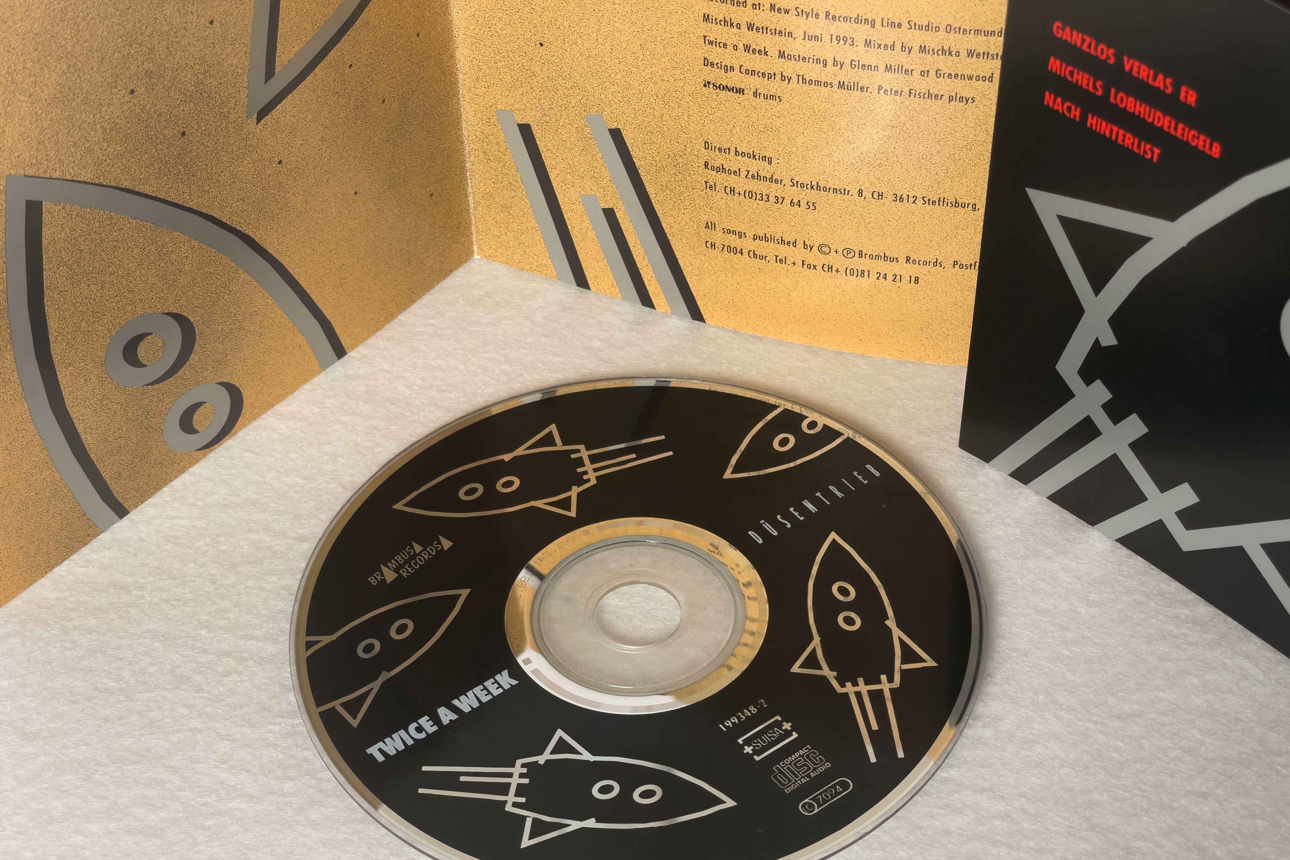 CD-Artwork für Düsentrieb der Jazzband Twice a Week aus Thun. Das Motiv kombiniert eine von Höhlenmalerei inspirierte Zeichnung mit einer Weltraumrakete – eine augenzwinkernde Anspielung auf den Titel und die kreative Energie der Musik.
